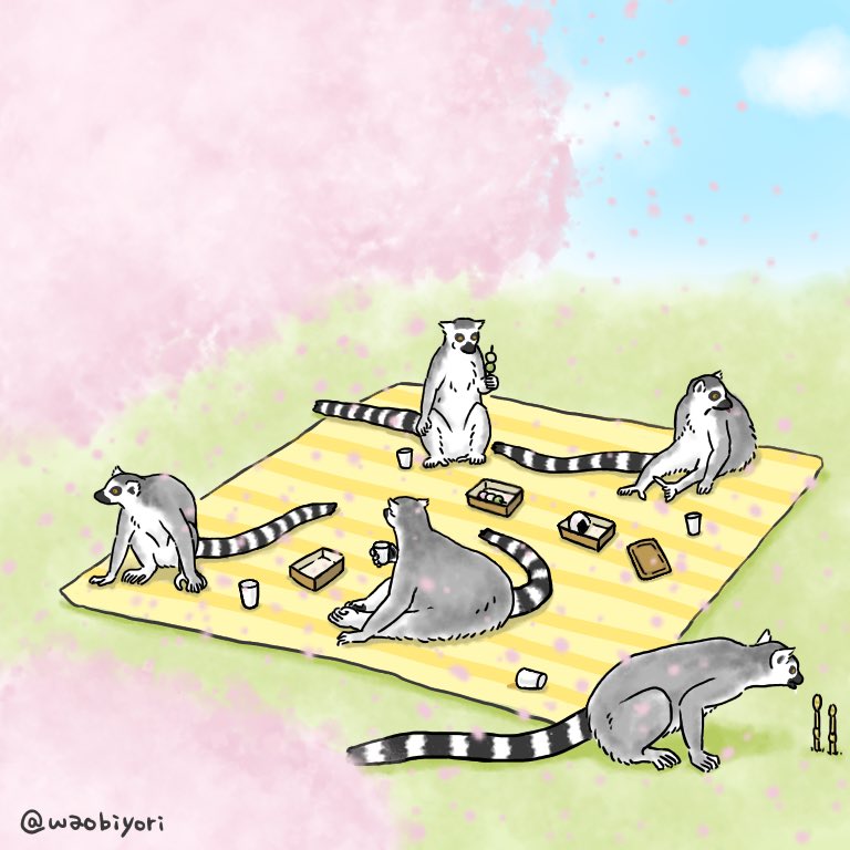 8 40 ゆっくりお花見できなそうなので、ワオに解消してもらう。あーこんな場所で寝転んでのんびりしたいな〜 しましまを塗るの楽しい。 #ワオキツネザル 20/04/02 21:51