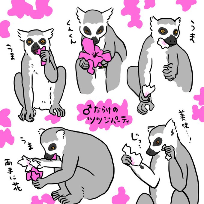 19 99 モンキーセンターのツツジパーティがかわいすぎた…皆がつがつ食べてて、口から花が出てるのとかめちゃかわ…で描いてみた。動画何回も見てしまう。芋がらパーティも良かったけど花の方が映える笑 20/05/27 14:26