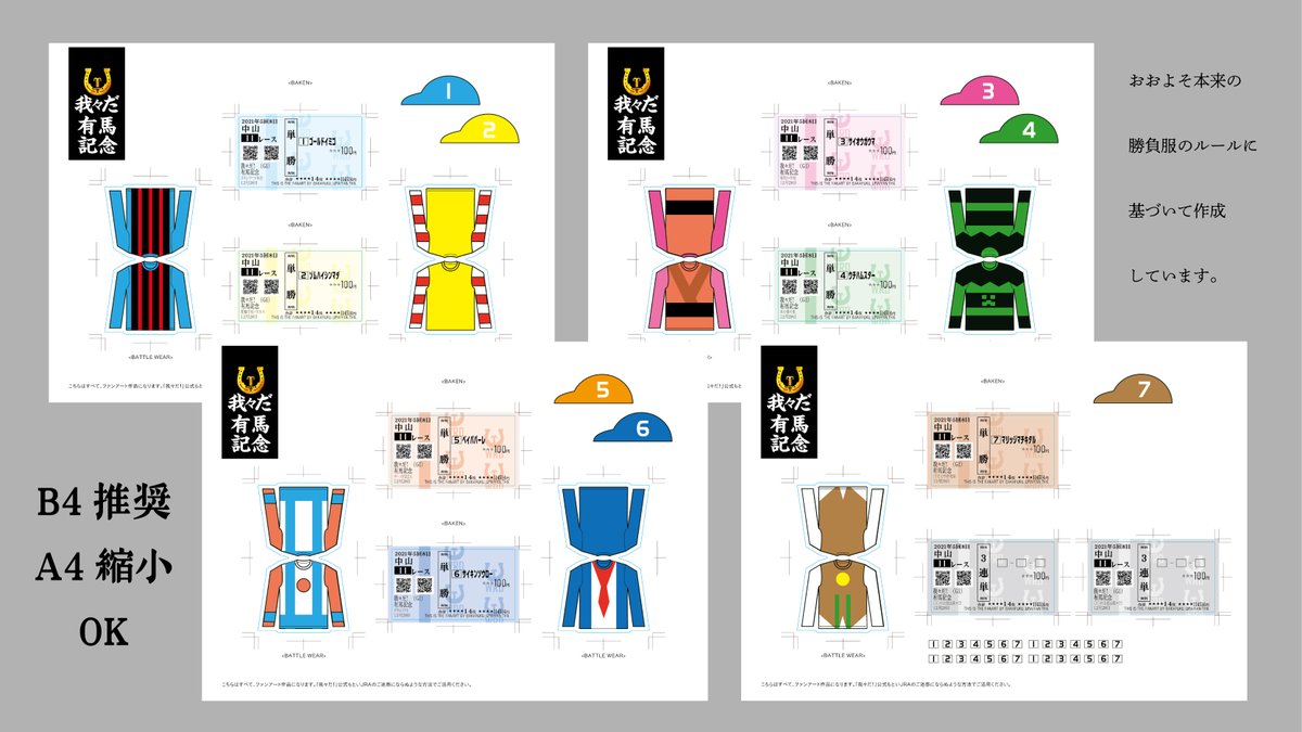 <馬券&ミニ勝負服プリント作りました> 悪ふざけしました。 是非遊んでみてね。 (ダッシュで作ったゆえ少し甘いため、3日限定でweb配布します。) firestorage.jp/download/49d3d… #我々だ有馬記念 #wrwrdFA