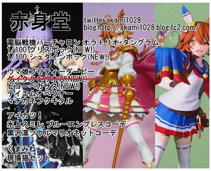 ワンフェスのお品書き作成しました! 卓番は4-16-04、バーチャロン・ウマ娘・アイカツ!・現場猫が主な販売アイテムです ブログには当日の販売についてもまとめたのでよろしかったら是非~ akami1028.blog.fc2.com/blog-entry-137… #WF2023W #WF2023Wおしながき
