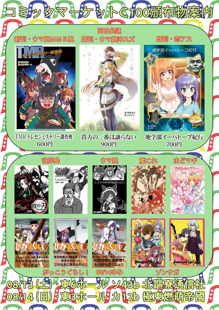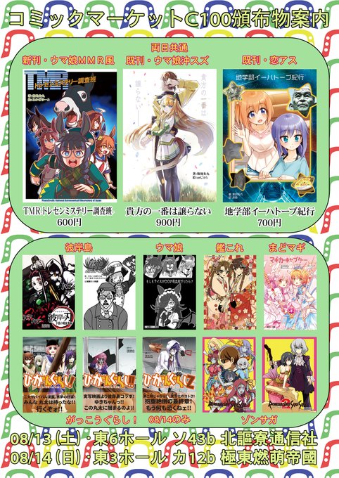 あなたのサークル「極東燃萌帝國」は、コミックマーケット100で「日曜日東地区 "カ " 12b」に配置されました!コミケWebカタログにてスペース配置場所公開中です! Webカタログに頒布情報一通り載せましたー。 webcatalog.circle.ms/Circle/Map/162… #C100WebCatalog #ウマ娘 #ゼンノロブロイ