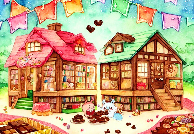 古本屋ちゃんとモモンガのためのお菓子と本まみれのドリームハウスを構築…🎈(背景とりんAIに加筆) #ちいかわファンアート