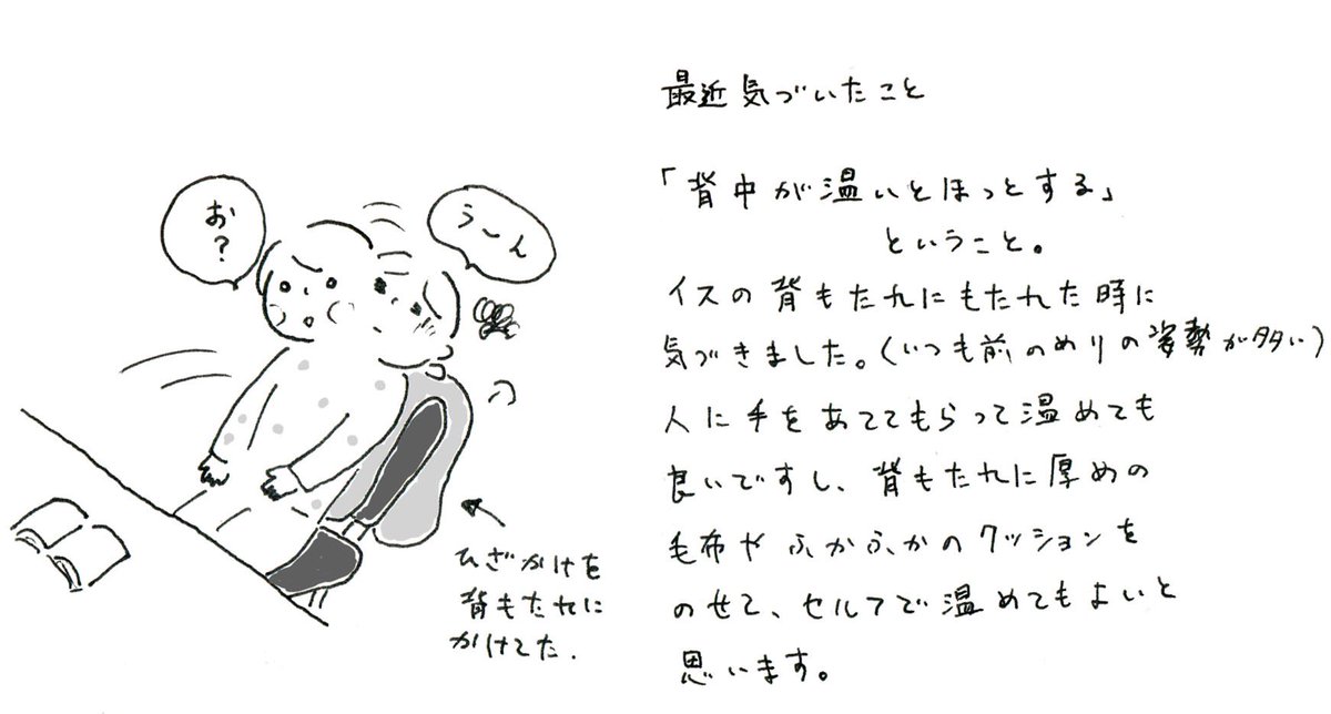 0 11 最近気づいたこと。 不安感や体調の変化があったからこそ気づくことがあるなと思いました。 #イラスト #不安な時 #背中温め 22/06/15 15:48