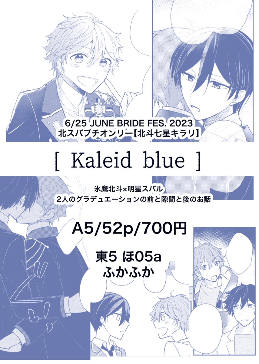 6/25JBF2023💍北スバプチ北斗七星キラリ新刊サンプル 『Kaleid blue』A5/52P/700円 東5ほ05a/ふかふか 「…青春ってもうすぐ終わっちゃうのかな」廃校騒ぎの最中、ふと北斗とのユニット結成時を思い出すスバル。グラデュエーションの前と隙間と後の2人の話。 サンプル💎 onl.sc/xgBFctX