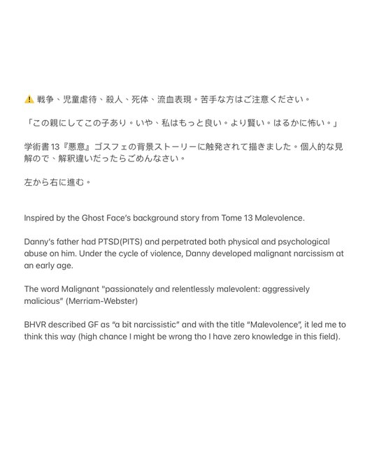 ⚠️TW: War, child abuse, murder, corpses, blood and gore. Nothing too explicit in my view but if these warnings trigger you, do not read. “They say like father, like son. But I’m better. Smarter. Much more scarier.” #dbd #Ghostface #deadbydaylight