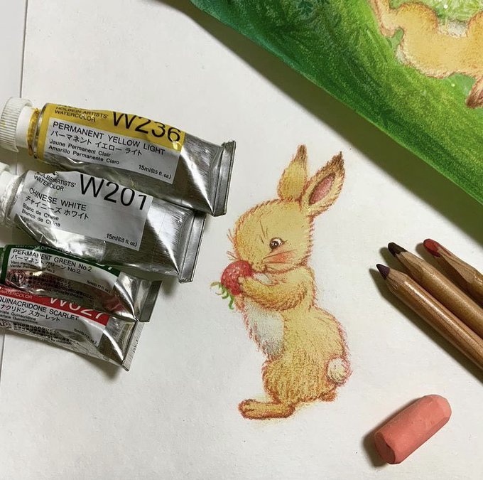 3 61 【水彩+パステル】画 このイラストは制作中のステーショナリーに使います。 #水彩 #ウサギ #アナログイラスト 22/04/03 14:06