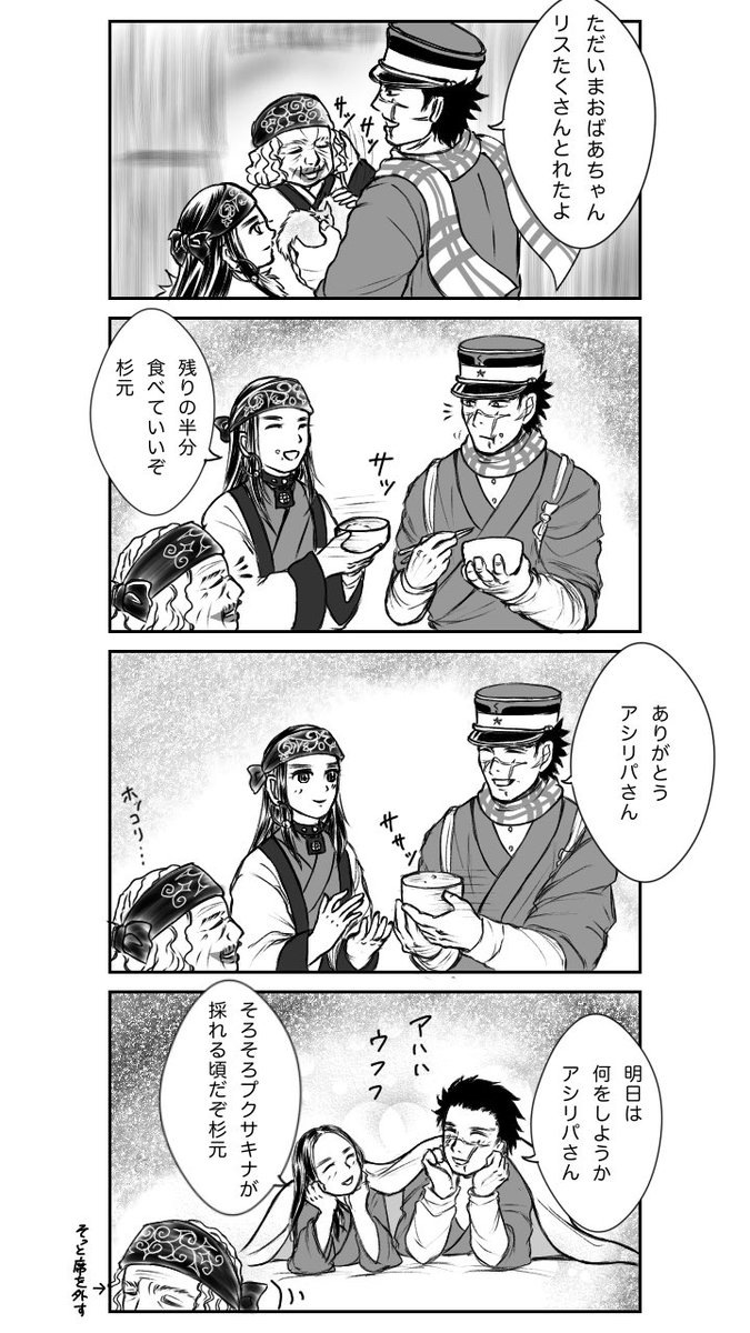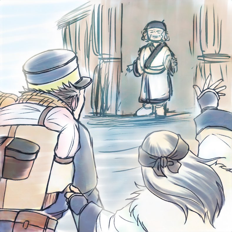#ゴールデンカムイ版深夜の真剣お絵描き60分一本勝負 【お題】好きなページ、シーン 「故郷へ帰ろうアシㇼパさん」 杉元が今の自分を受け入れられた瞬間でありアシㇼパさんがやっと心からの笑顔を見せたシーンであり、その後一緒に帰った二人を笑顔で出迎えるフチの姿まで想像できて大好きなシーン
