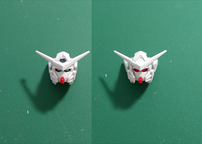 【HGエクシアリバイヴ化日記1日目】 一番に手を入れたいお顔から改造。 HGエクシアの頭部は両端が平行に造形されています。なので耳のアンテナに向かって八の字に開くように改修。 顔は前に出過ぎなのかひょっとこ顔の印象を受けたため0.5mm程奥に位置変更。 #エクシアrevive #ガンプラ改造 #ガンプラ