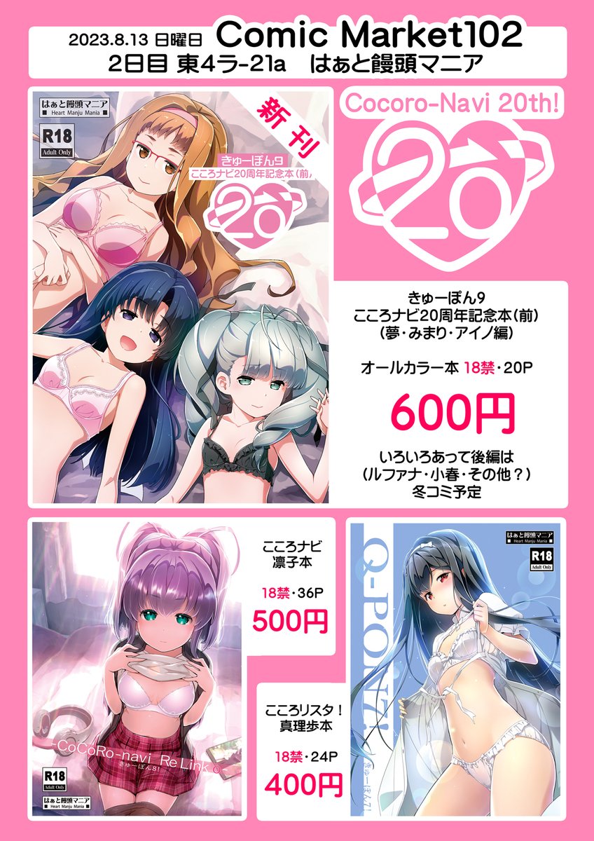 こころナビ20周年 夏コミお品書きです! 新刊は「こころナビ20周年記念本」前編になります、後編は冬コミ予定! ショップさんにて新刊予約始まってます 🍈 melonbooks.co.jp/circle/index.p… 🐯 ec.toranoana.jp/tora_r/ec/cot/… どうぞよろしく! #C102