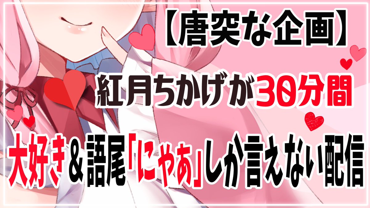【唐突な企画】紅月ちかげが30分間大好き&語尾「にゃぁ」しか言えない配信 1月7日 夜23時~23時30分まで リスナーは見に来ていいよ、、あとはだめにゃっ! 【待機所はこちら・・・】 youtube.com/watch?v=3w00oK…