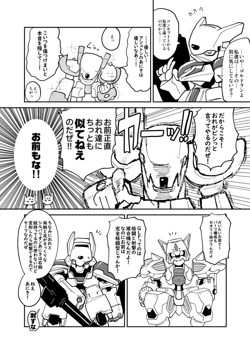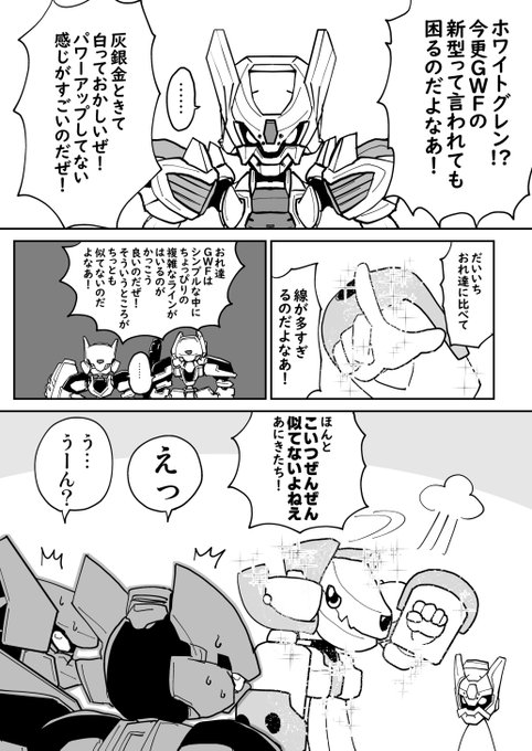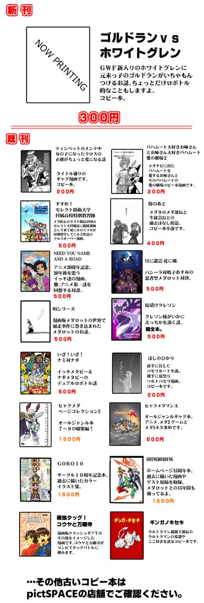 新刊サンプルとお品書きです。 GWF新型のホワイトグレンに元末っ子のゴルドランがいちゃもんつけるお話。表紙はまだですすみません。 前回のボンボンオンリーで作った本も置いてありますのでよろしければ。本日21時にお会いしましょう! pictsquare.net/uml0tac8dkxx4l… #MMVer07