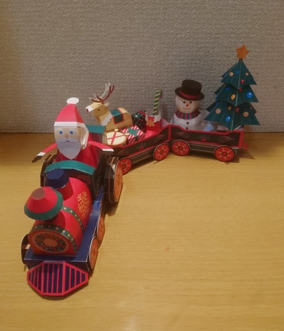 #ペーパークラフト :クリスマストレイン。集中力を保つために酒を控えがんばりました(真?)。明日チビたちに渡せます。写真右下は前回切り貼りした同じシリーズのX'masCarですが、今回の方が少し難しかったです。 #キャノンクリエイティブパーク #CANONペーパークラフト creativepark.canon/jp/contents/CN…