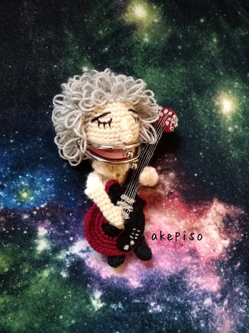 26 124 QUEENのブライアン博士のがま口ができました。レッドスペシャルは猫にはならず、ギターとして完成しましたよ🎸 #がま口 #あみぐるみ #Queen #brianmay 21/05/10 19:09