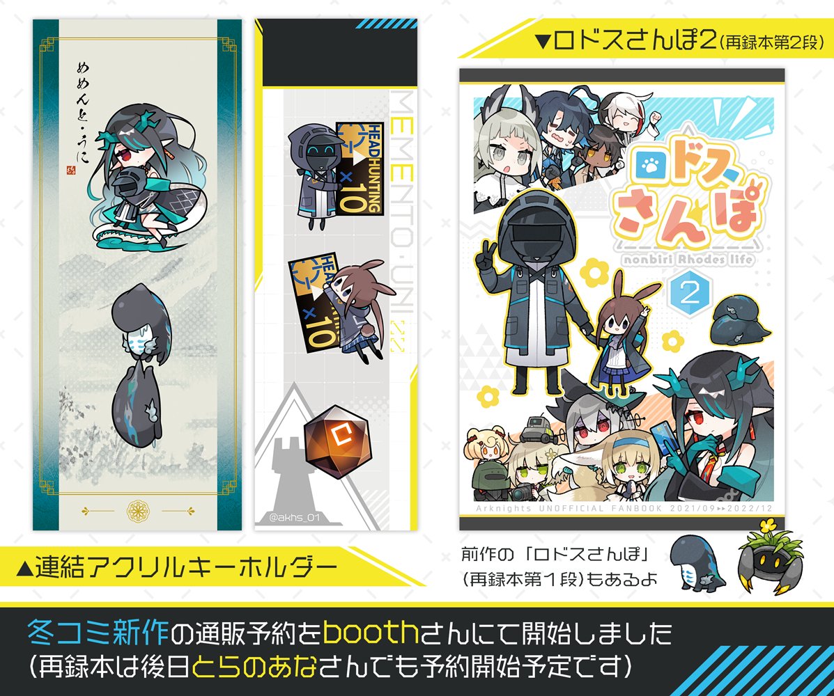 冬コミ新作の再録本とアクキーの通販予約をboothさんにて開始しました!よろしくおねがいします~ ◆ロドスさんぽ2(再録本第2段) ccrr.booth.pm/items/4385682 ◆ドクター・アーミヤちゃん・源石の連結アクキー ccrr.booth.pm/items/4370311 ◆シーさん・クヒツムの連結アクキー ccrr.booth.pm/items/4370344