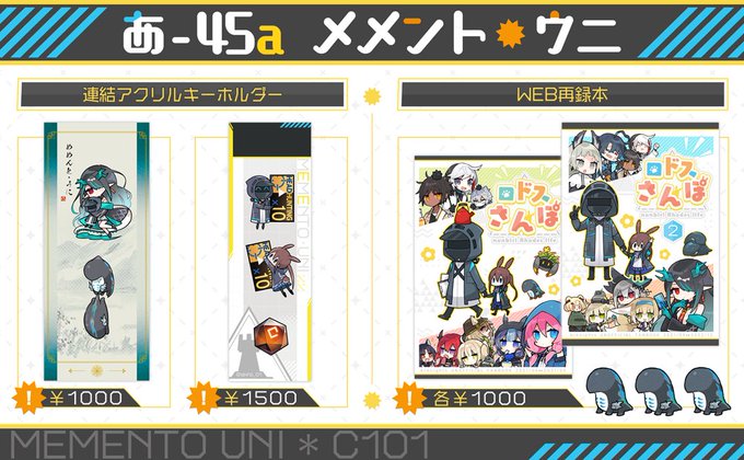 C101のおしながきです アクキー2種類・再録本2種類に、小さいペーパーをお付けする予定です。 【1日目 西あ-45a メメント・ウニ】でお待ちしております🐰✹当日はよろしくおねがいします! ▼通販予約 ⛄BOOTH(本とグッズ) ccrr.booth.pm ⛄とらのあな(本のみ) ecs.toranoana.jp/tora/ec/item/0…