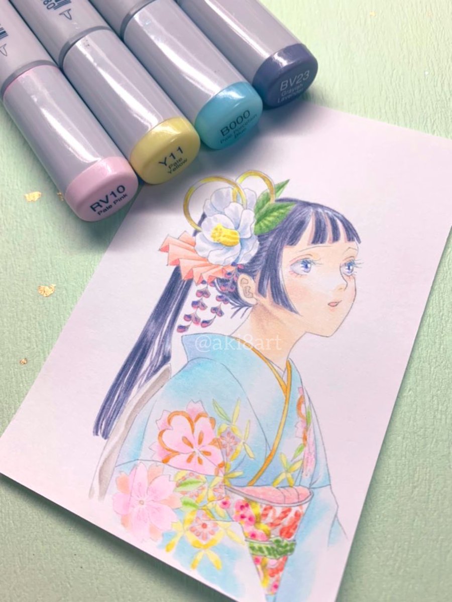 着物は生地によって柔らかさがぜんぜん違ってツヤ感が変わるので これは振袖で使われるような良い生地をイメージしてミニ原画を描きました🌼 あとシンプルに柄が困難でした・・・でも楽しかったです🥺 #コピック #イラスト