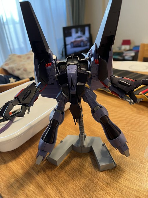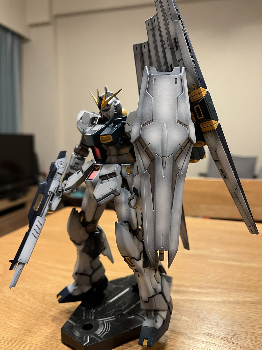 本日怒涛の2作品目完成! キットの箱を開けたのは11月くらいですが、今朝やっと塗装終わりました。 白系3色の配色がイマイチですね。 デカール貼るか悩んで、ひとまずトップコートなしでフィニッシュ! #ガンダムベース東京 #ガンプラの画像貼るとRTされると聞いて #νガンダム #グラデーション