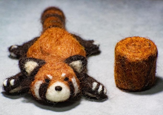 5 23 丸太もつけてなんとか完成。 一応床はコンクリートのつもり。 レッサーパンダならぬベッチャーパンダ♪暑くて大変だからなんだけどこのポーズ結構好き。 #レッサーパンダ #羊毛フェルト #ぬいぐるみ 21/06/24 16:46