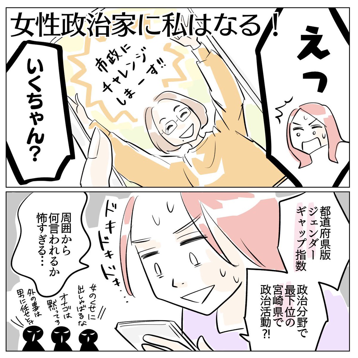 同じ年の女友達が「政治家になりたい」とか言ってるけど、どうした!? って漫画描きました。 @guutaraco #ぐうたらこ #はらだいくみ #女性政治家を応援したい #漫画が読めるハッシュタグ