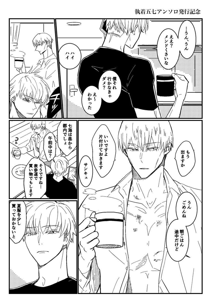 昨日配布の執着五七アンソロ『dependence』記念ペーパー掲載漫画です!私の分は3ページです! スペース来て頂いた方ありがとうございました🙇♀️✨✨✨