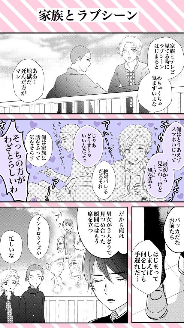 「家族でテレビを見ていて急にラブシーンが始まってしまった時」 #江口くんのももいろエブリデイ #漫画が読めるハッシュタグ