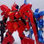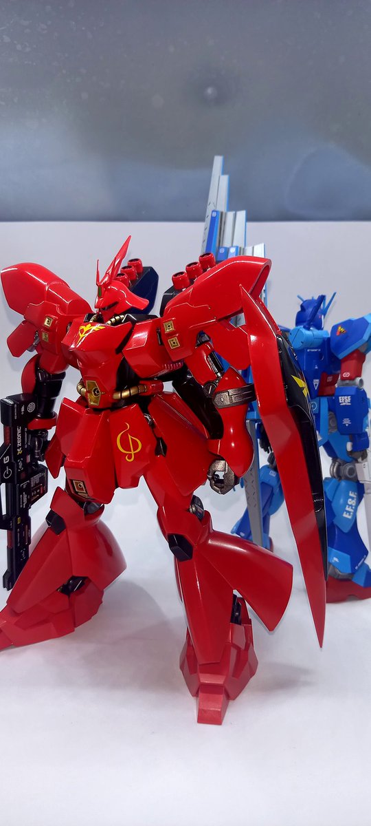 おはようございます、昨日のサザビー完成ツイートにたくさんのイイネ、コメント、RTありがとうございます😊 以前作ったニューガンダムと一緒にと完成記念写真です。目を合わせるのはお互いにイヤだそうです😁 #ガンプラ #ガンプラの画像貼るとRTされると聞いて