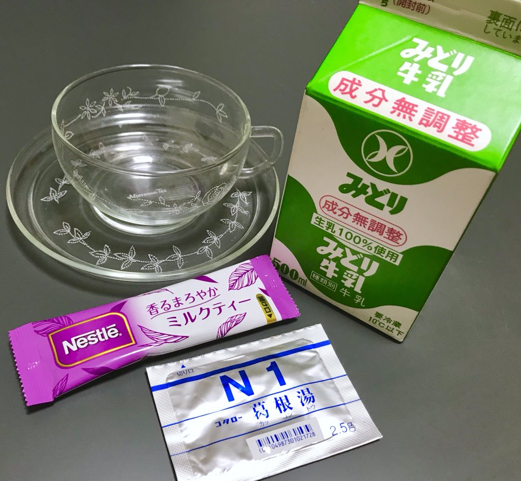 寒い日に飲みたい禁断のチャイ!! 葛根湯とインスタントのミルクティーの粉をカップに入れたら、少しのお湯でしっかり混ぜて溶かし、アッツアツの牛乳注ぐだけ。まじ美味いから!!なんていうかケミカル美味い( ˘ω˘ )