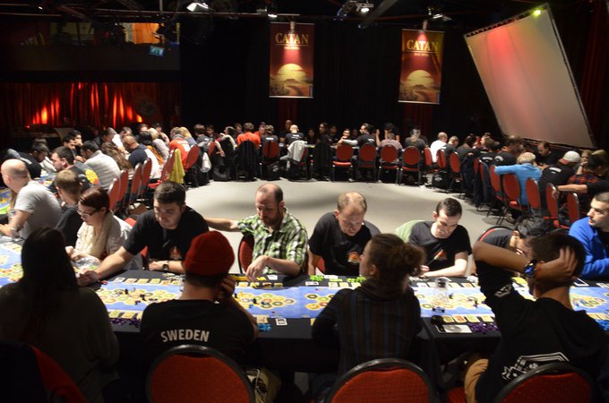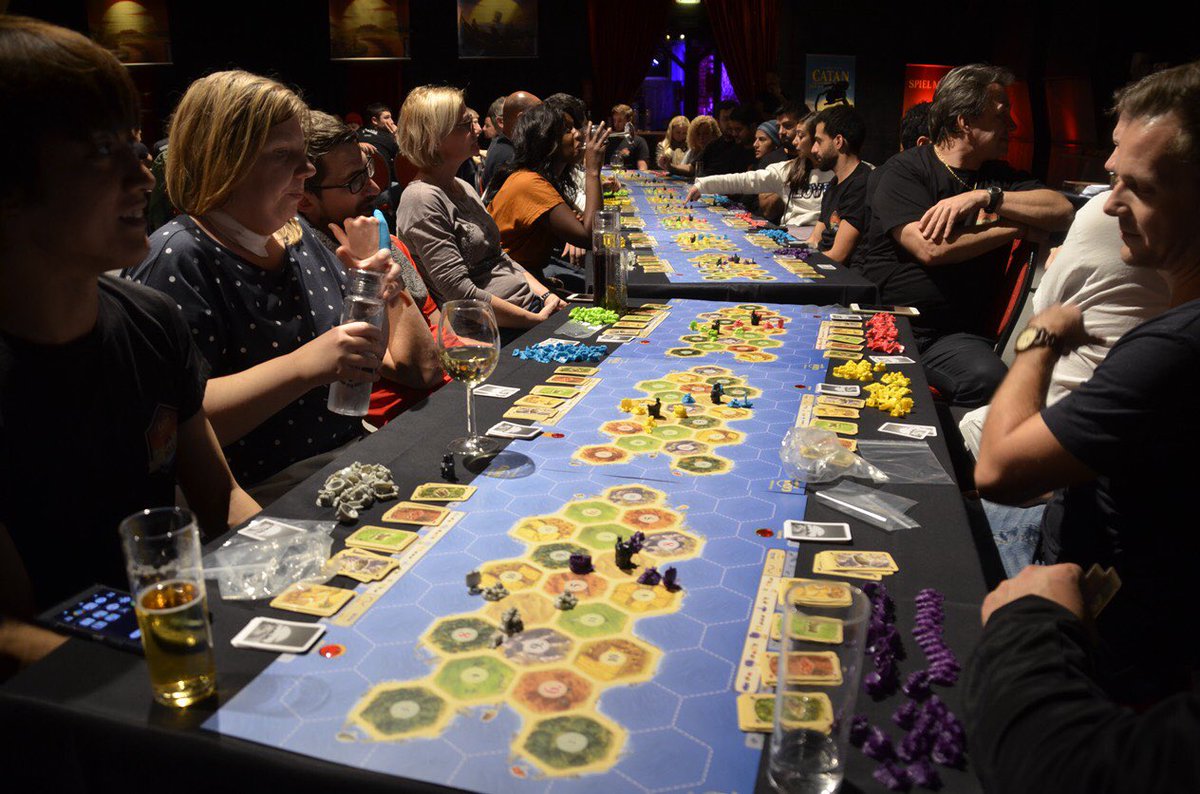 1日目の夜に各国の代表プレイヤーや観戦者の方々など、総勢72名の参加で行われた『カタンビッグゲーム』の様子です!!ぐるりと繋げて1枚のながーーいシートになったカタンを、全員で開拓します!!圧巻の光景でした(ꉺꈊꉺ)