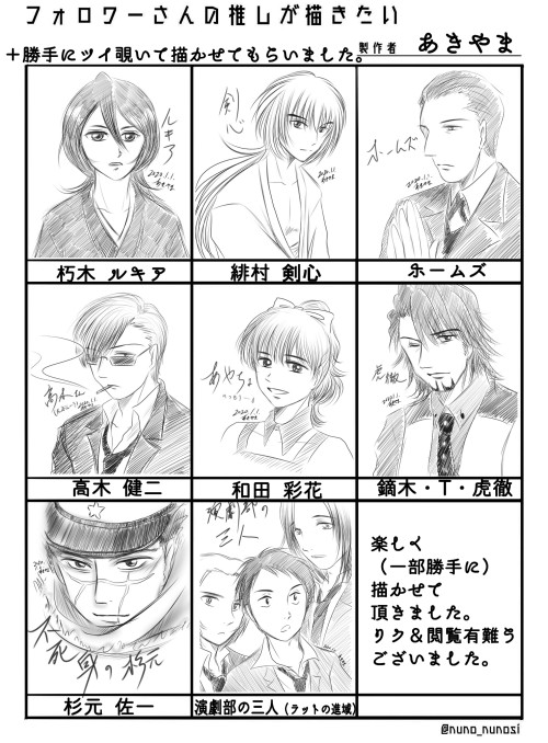 正月で家族と過ごしていて、ツイッター見ていない人も多い中でやるという無謀さ。リク頂いた物、あと勝手にTLに最近流れてきたフォロワーさんのツイから印象的だったキャラ描かせてもらいました。(推しじゃないだったらごめんなさい)希望者居ればあと3枠追加可能。 #フォロワーさんの推しが描きたい