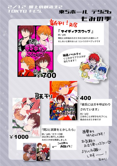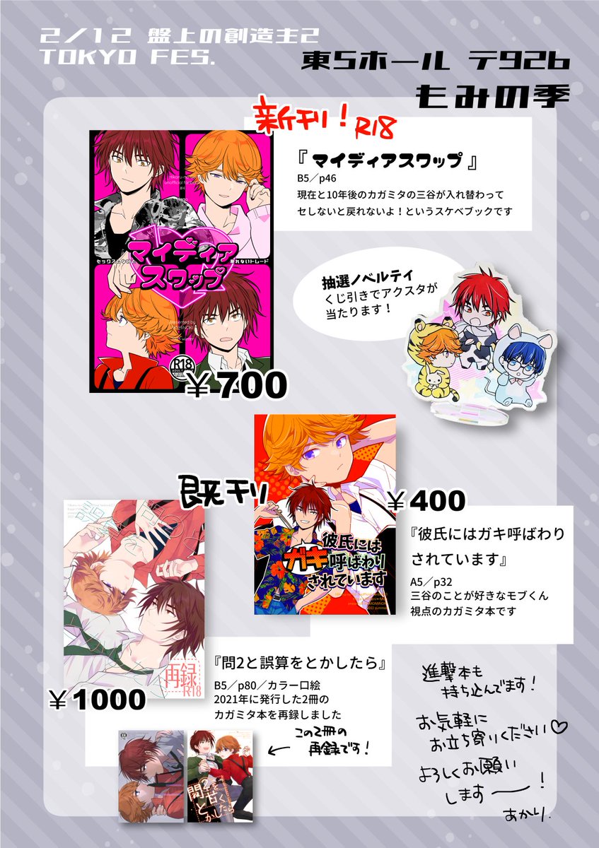 4 13 おはようございます!盤上2のお品書きです!新刊サンプルの用意が間に合わなかったので大人の方はお気がねなくお手にとって中身ご確認くださいませ🙇♀️ 本日はよろしくお願いします!イベント楽しみましょう🥳🎶 23/02/12 09:07