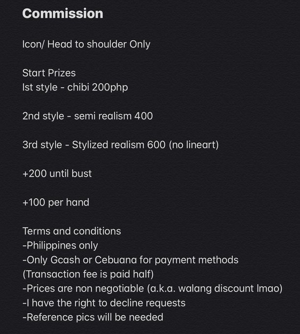 Hello frends! Something came up bc of my dumbass and I’m gonna need to do commissions to fix it ... for now I’ll post my prices ,, I’ll post another proper one with samples when I’m done making em .... An RT would be a big help :) #artph #ArtistsofSEA #ArtistOnTwitter #Art