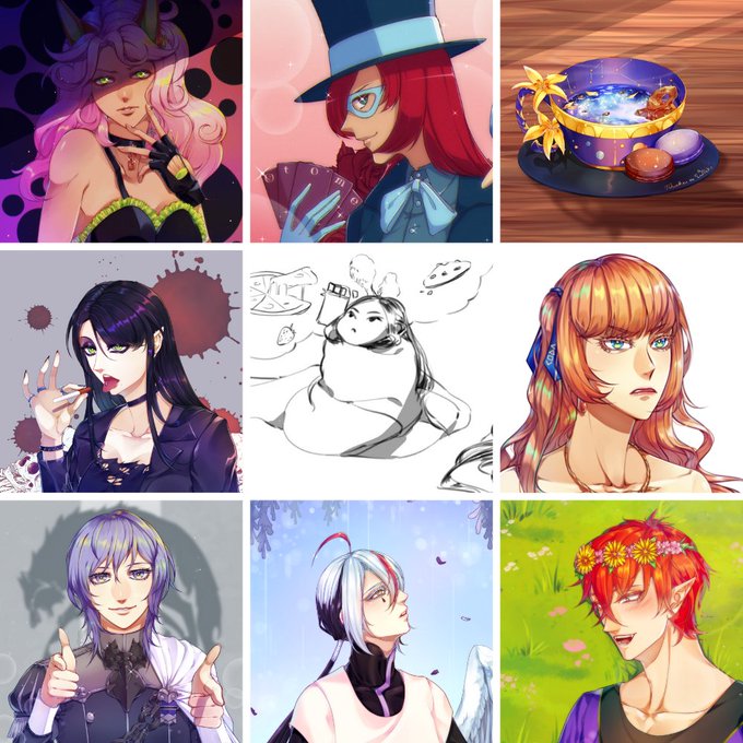 #artvsartist2021... Lots of stuff I drew was for visual novel projects, so I can't really share them unless you want spoilers. I could make a collage of just sprite I did this year, tbh. Also top right concept and lineart by @PumpkinSpike. #artvsartist