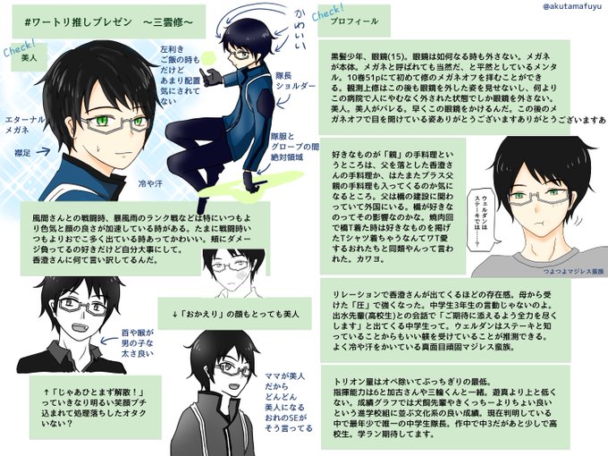 ワートリログ8 | mafuyu #pixiv pixiv.net/artworks/99785… 描いた絵まとめました🎉 デコ出しスーツをずっともぐもぐしてたりアニメで興奮してたりコラボグッズに召されたり三雲修に狂ったりしている。修が9割かも。