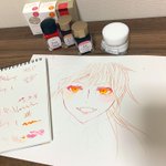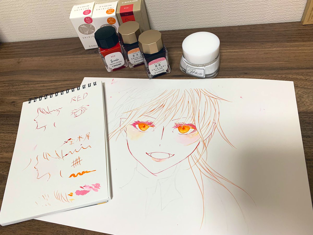 とりあえずやってみた! セーラーの四季織シリーズとSTORiAシリーズ! 初!ボトルインク! 後にこの練習動画あげるとして模索しながら描いてみたけど使えるには使える! 練習がめっちゃ必要そう 無理そうなら筆で線やろうと思っている 金木犀の色味が好きすぎる #イラスト