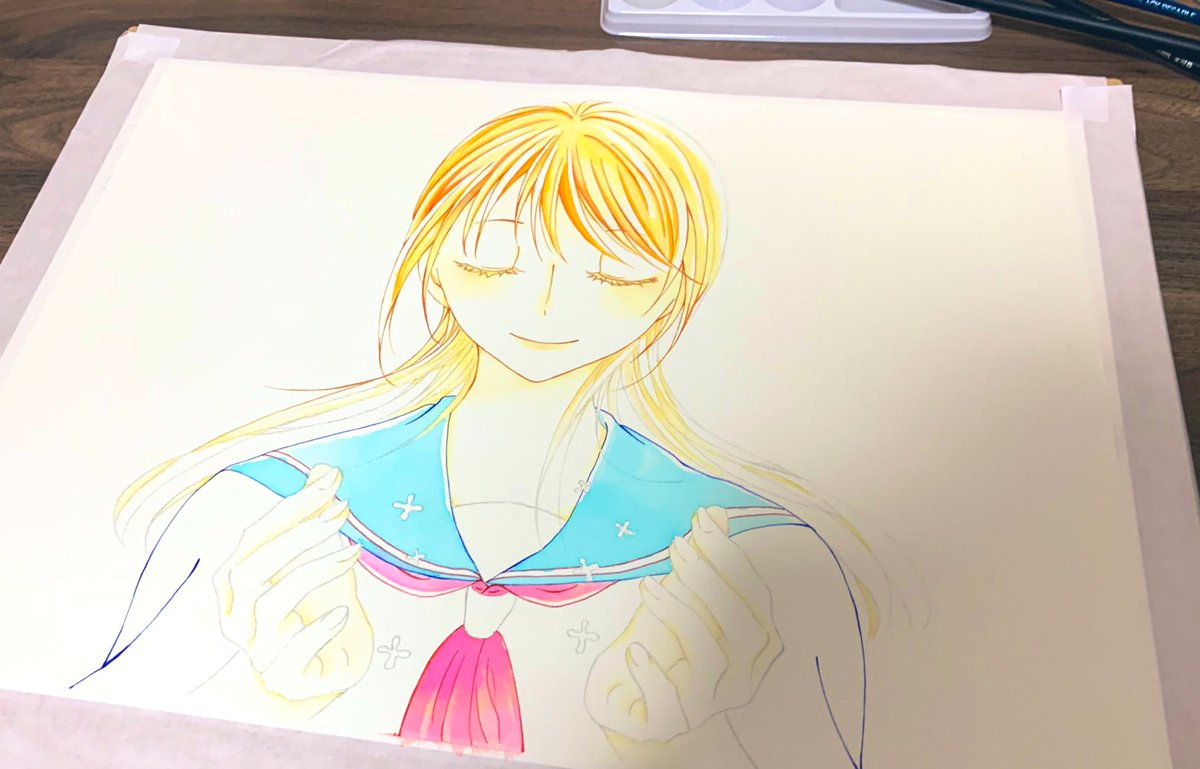 最後までとりあえずやったけど失敗してしまったやつ🙂 顔めっちゃ上手く塗れたのにね 悲しいぜ 若鶯買ったから使いたくてやったけど難しいねー #イラスト #セーラー万年筆