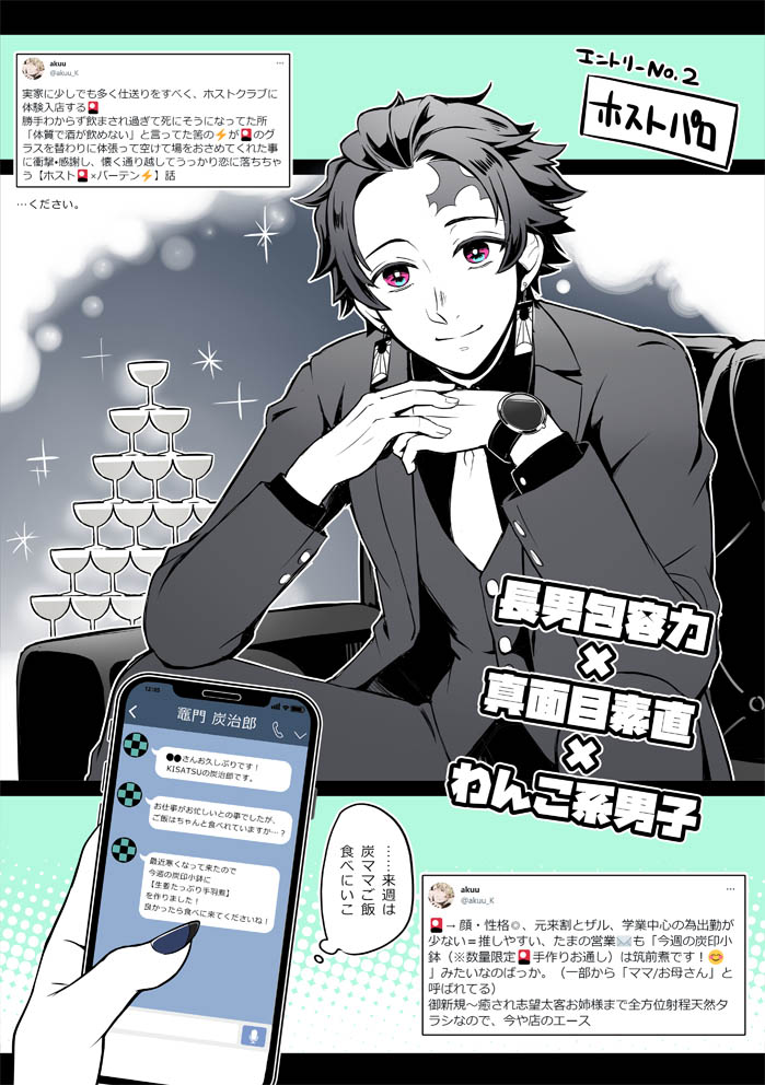 【炭善妄想詰】 ②ホストパロ 太陽の化身のような爽やか好青年の🎴が、お高く綺麗なスーツを着こなして煌びやかな夜の店で何千万と稼ぐ敏腕プレイヤーにしてる様を考えるのは、抗いようが無くグっと来ちゃいますよね…🙏 あと真剣な顔でシェイカー振る⚡は絶対格好いいからバーテンダーしてぇえええ…