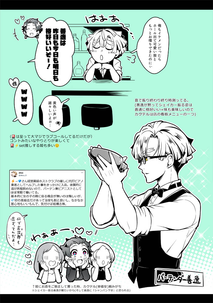 23 134 【炭善妄想詰】 ②ホストパロ 太陽の化身のような爽やか好青年の🎴が、お高く綺麗なスーツを着こなして煌びやかな夜の店で何千万と稼ぐ敏腕プレイヤーにしてる様を考えるのは、抗いようが無くグっと来ちゃいますよね…🙏 あと真剣な顔でシェイカー振る⚡は絶対格好いいからバーテンダーしてぇえええ… 23/01/20 21:58