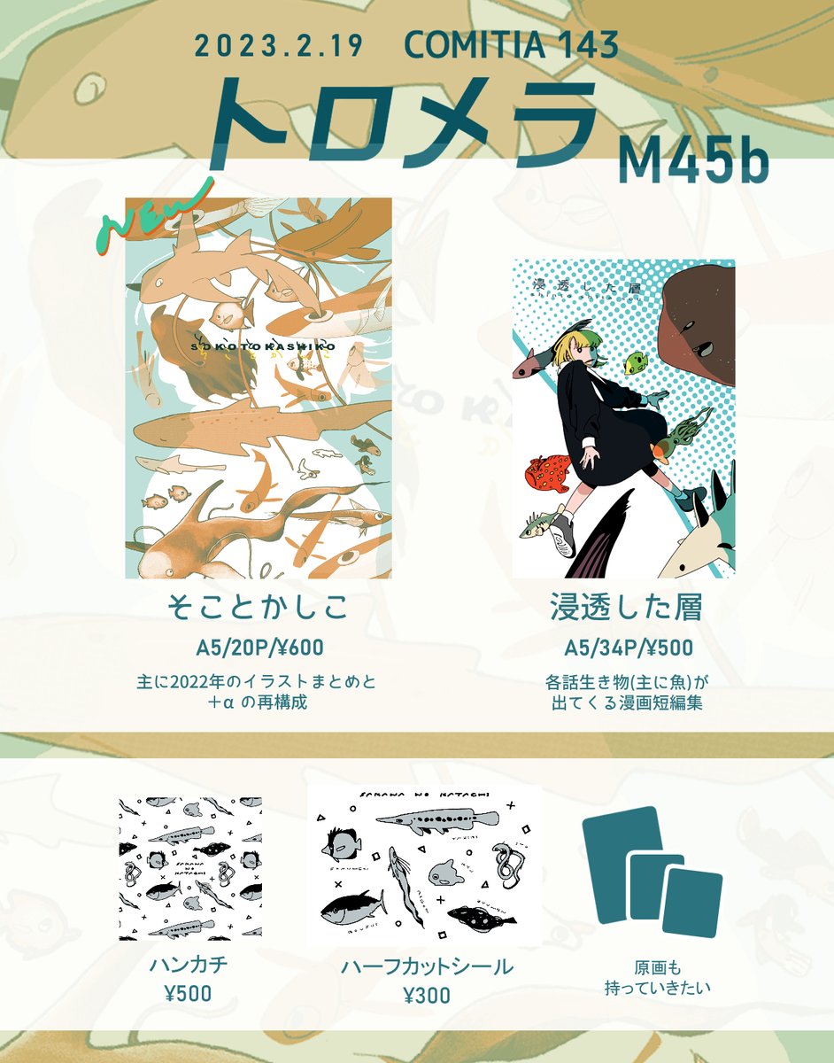 2/19コミティアのお品書きです! イラスト好きなようにまとめた本を新刊にひっさげ、既刊の漫画本やその他アイテムも持って行きます ブースM45bですぜひのぞいてみてください~ #コミティア143 #COMITIA143