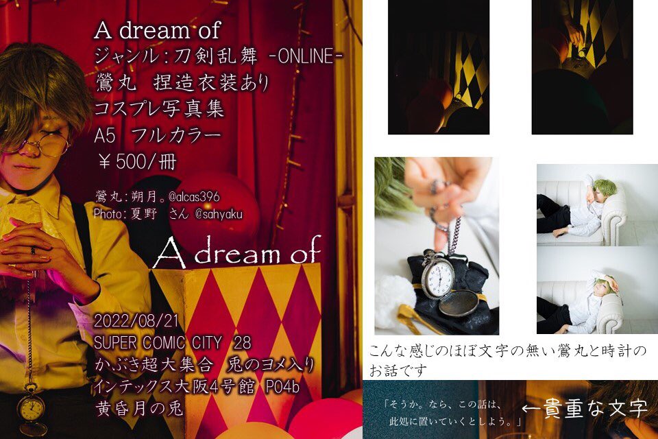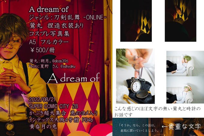 8/21 SUPER COMIC CITY 28 インテックス大阪 4号館 P04b 黄昏月の兎 スペースに夏野さんに撮って頂いた鶯丸捏造衣装ありの写真集置かせて頂きます〜ジャンル違うのでこそっとね ALTに画像内テキストと同じやつ載せてるので読み込めない人はそちらをご参考くだされ〜 twitter.com/yuura9/status/…