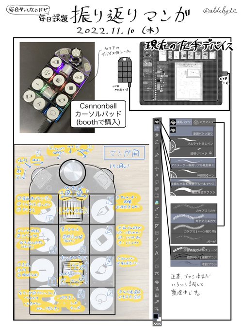 だいぶ回が開きましたがマンガ描きツール第2回、左手デバイスです! 今使っているこれははやしたろう(@w_vwbw)さんのいわゆる自作キーボード(ただし私自作できないので組み立てサービス利用)をboothで購入させていただきました! #コルクラボマンガ専科 #振り返りマンガ #マンガじゃないけどヨシ