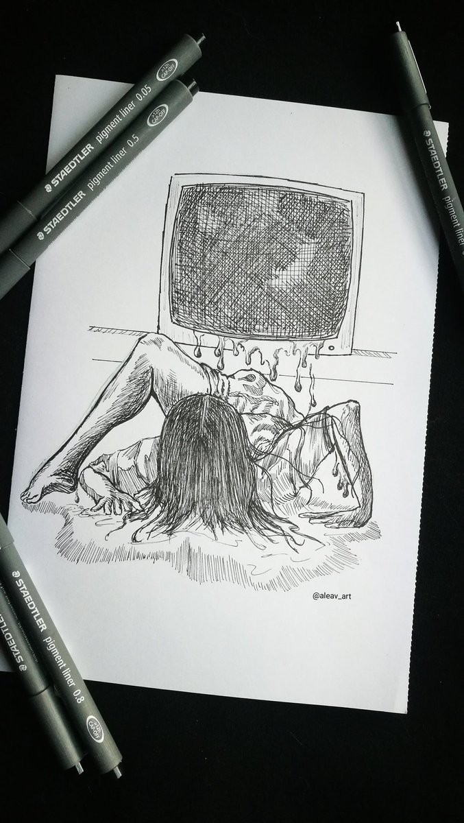 "Cindy, tvs leaking!!" 😂😂 Que día el de hoyyyy!. Casi ni llegó a sacar fotos. #inktober2021 #leak #fuga #day23 #ink #inktober #dibujo #arte #art #sketch #sketching #sketchbook #tinta #staedtler #staedtlerfineliner #inkmonth #mestinta #horror #scarymovie #samara #thering