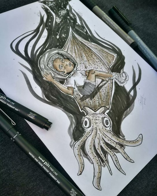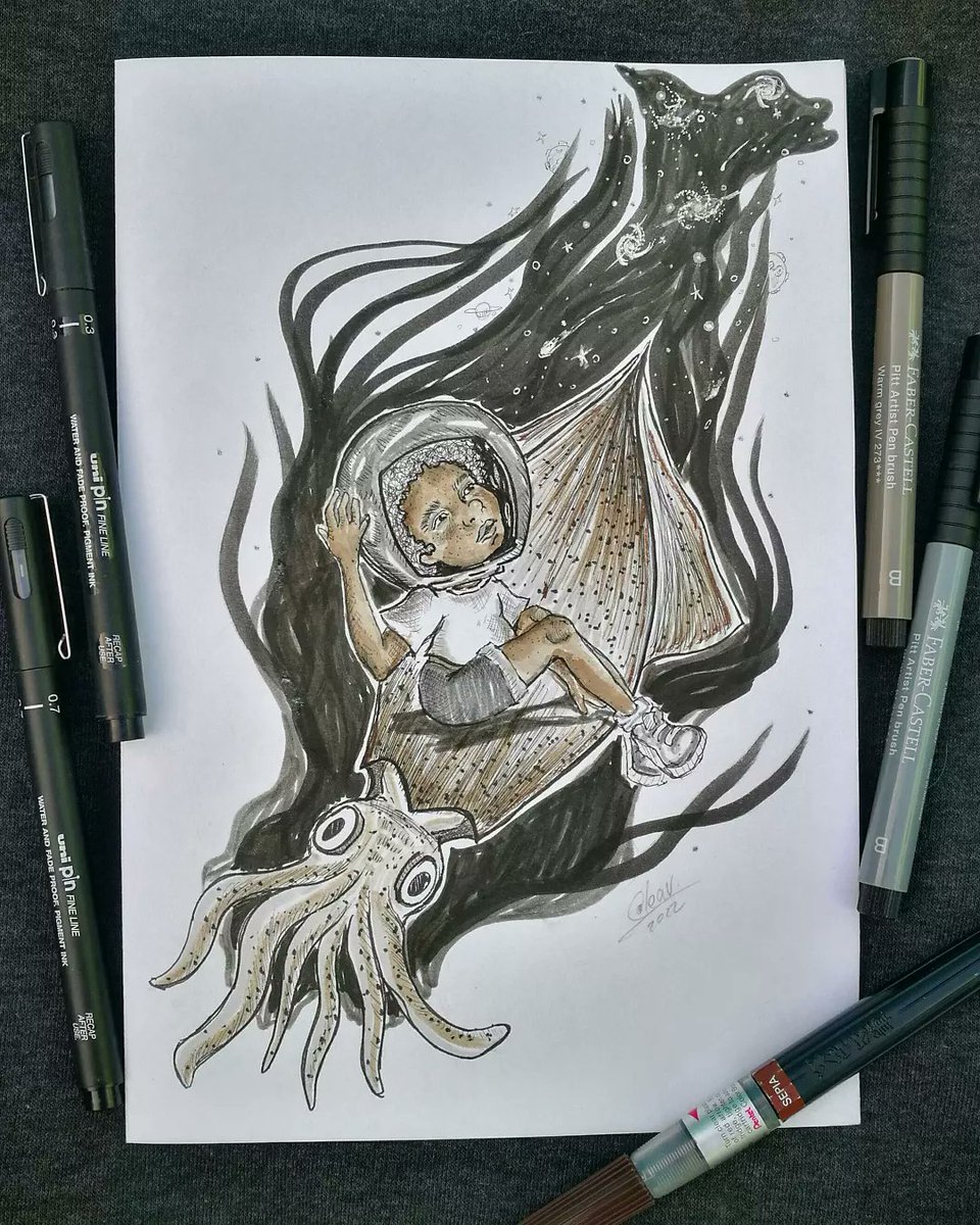 Día 07: Viaje/ Trip #inktober2022 Mi pequeño viajero de cabello alocado... ya empezaba a preguntarme donde lo había dejado.🌌🌌🌠 #inktober2022trip #inktober #owncharacter #viaje #inkdrawing #ink #tinta #sketchbook #inking #art #arte #trip #sketch #blackandwhite