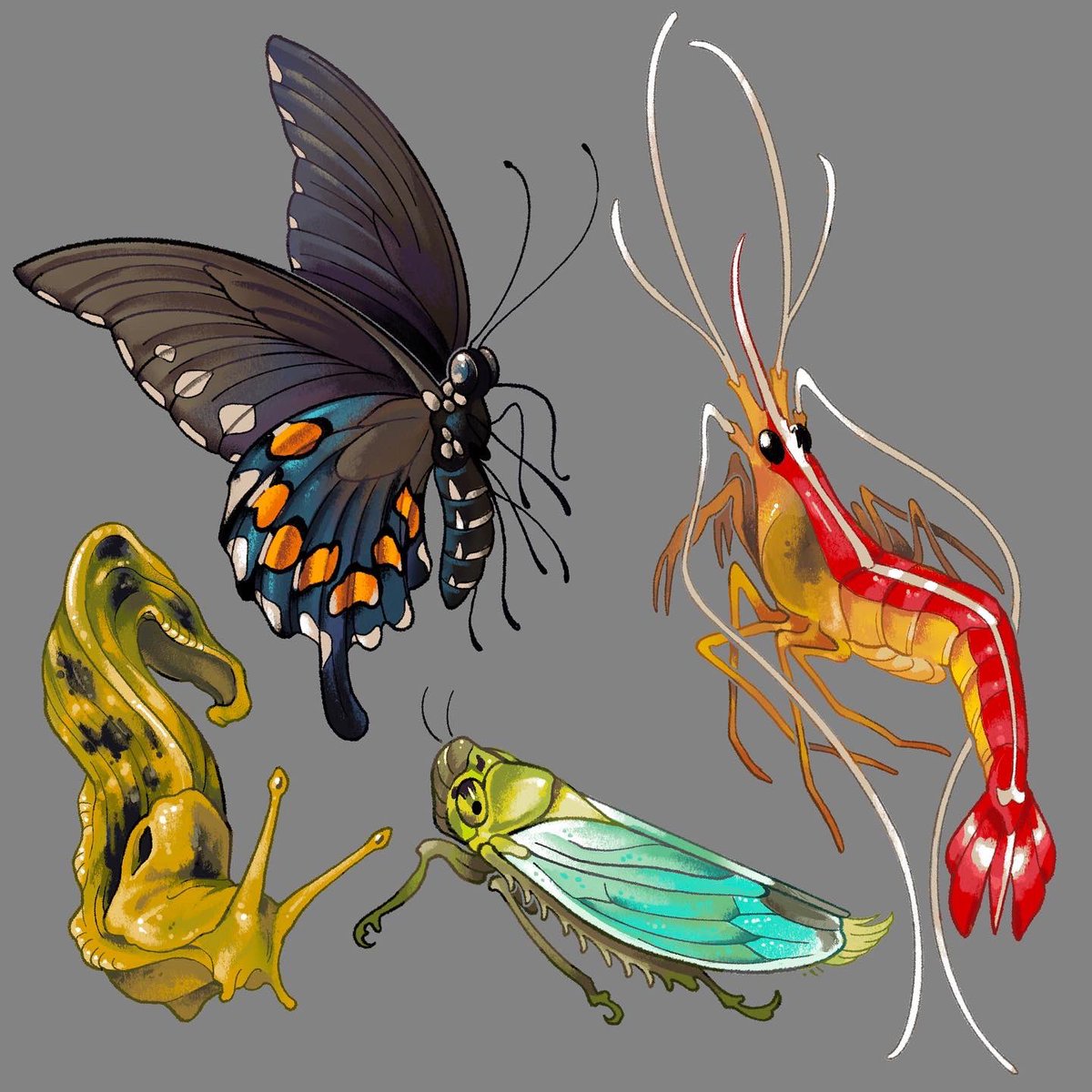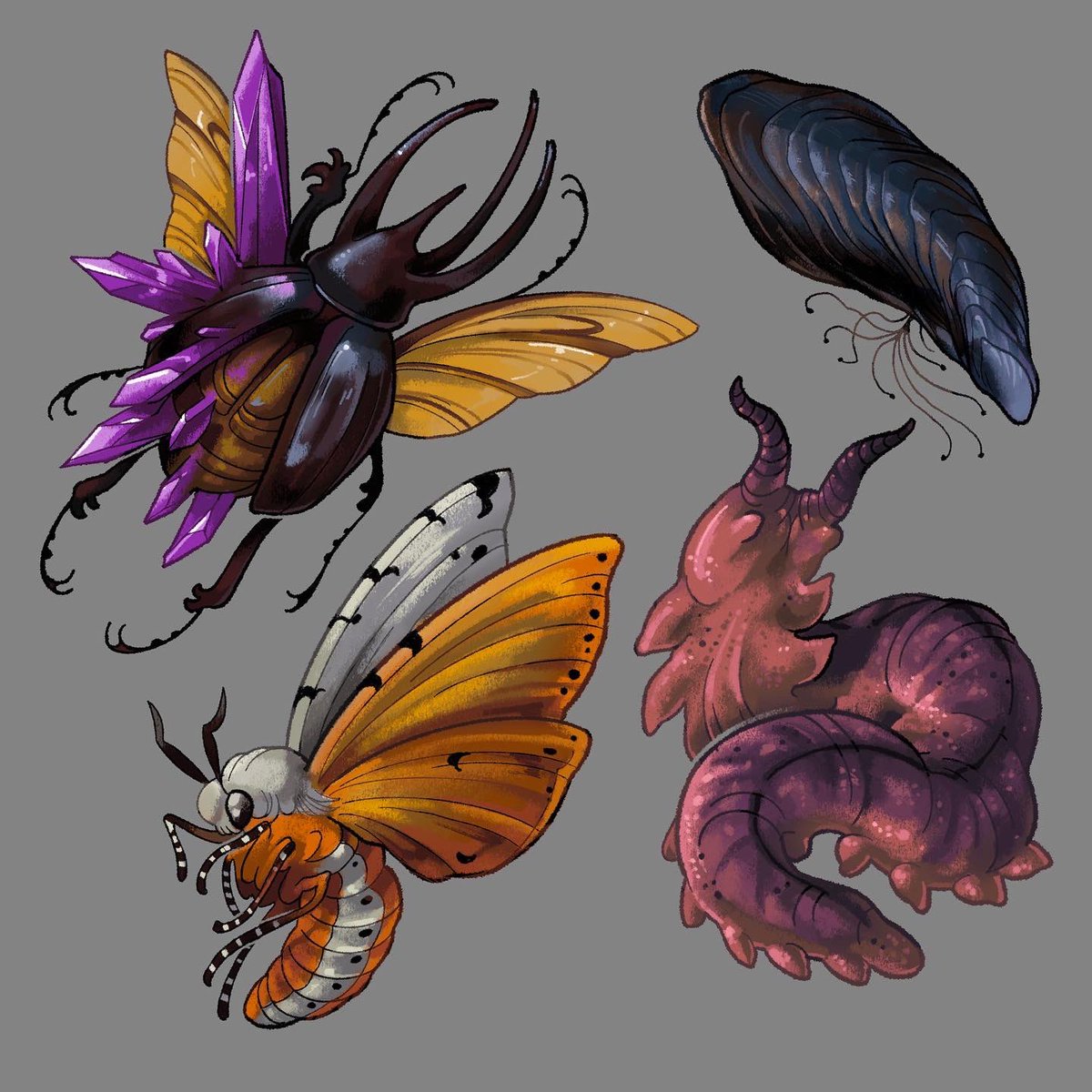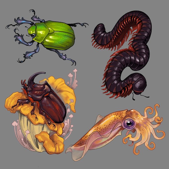 first four of #Invertober2022 — european rhino beetle & bigfin reef squid comprising days 3 & 4!