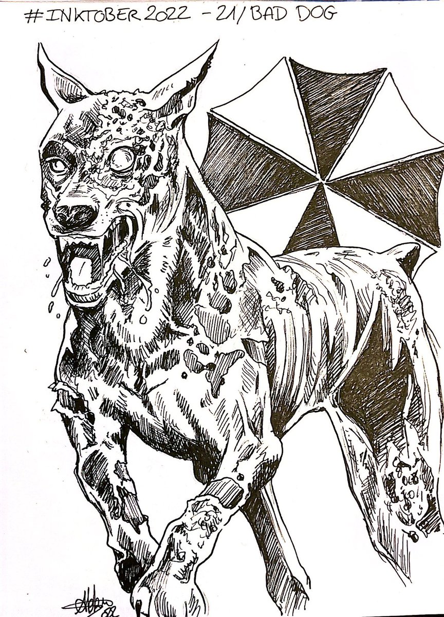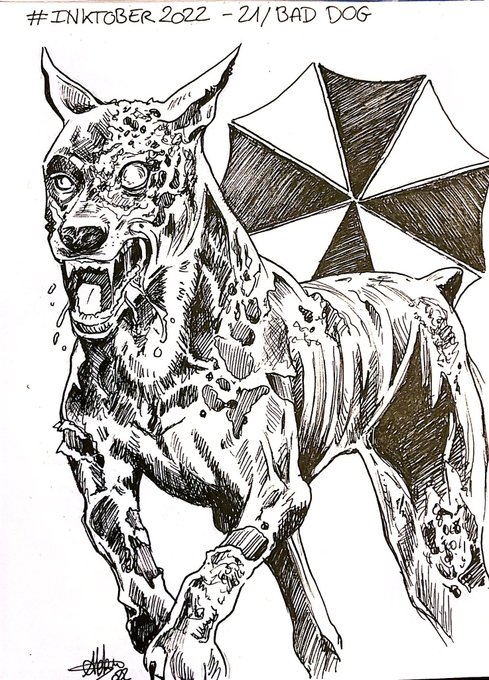 🎨 #inktober2022 🎨 21/ #baddog / #mechantchien . Ça change de ce que je fais d’habitude mais quand j’ai vu le sujet j’ai direct pensé à ça, ces chiens m’ont « traumatisée » ahah 😱😂🎮🧟♂️🧟♂️ Et j’aime tellement faire ce style de gribouillis hachurées 🥰