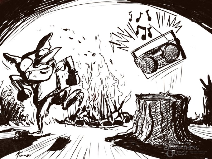 #Radio #inktober2020 #somethingquest “DAY 4 – Radio” Oh man, I love camping and campfires. Doing this drawing was super fun! You can almost feel the heat from the fire radiating. I imagine the goblin is listening to some kind of 80s ballad.