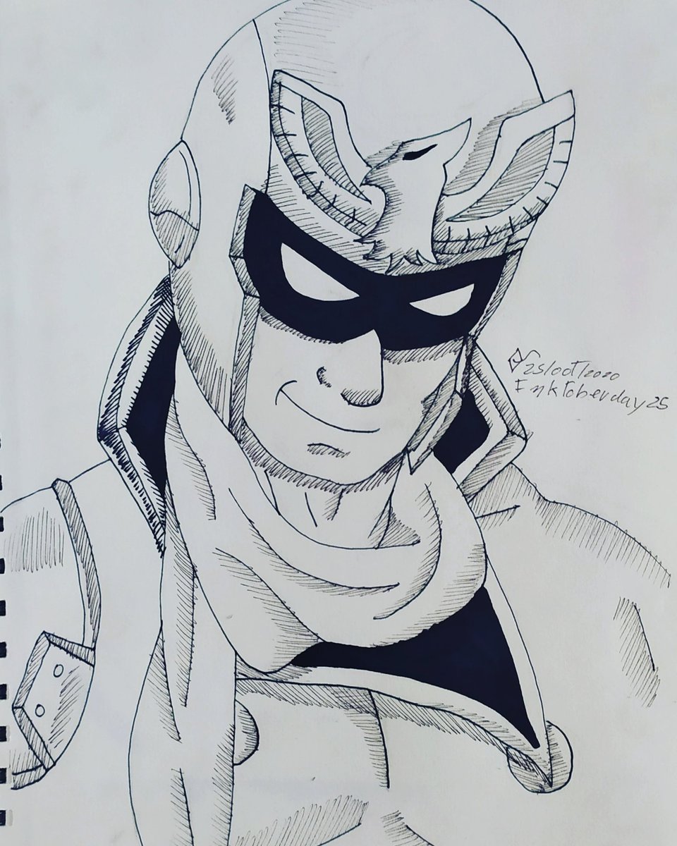 Dibujo del día 25 del #inktober2020 , esta vez del personaje de #captainfalcon del videojuego de #fzero #captainfalconfanart #fanart #art #videogame #gametober #alexeriesarts #inktoberday25 #nintendo #capitanfalcon #sueprsmashbrosultimatefanart #supersmashbrosultimate