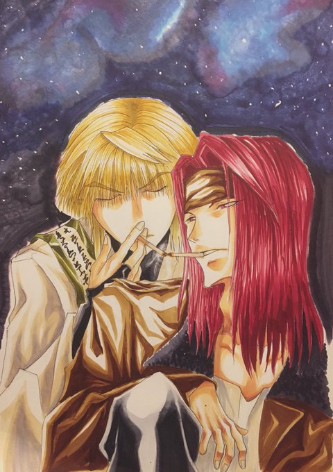 三蔵と悟浄 画集の天蓬と捲簾を書き換えました😋 オリジナルを描くは難しいので、まずはワンステップレベルを上げて(o^^o) 夜空描いてみたけど、難しい😥 エアーブラシ買おうか検討…。 #最遊記 #三蔵 #悟浄 #コピック #アナログイラスト #模写