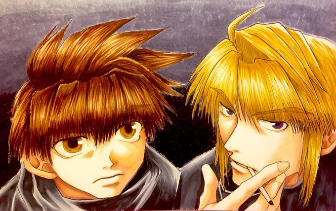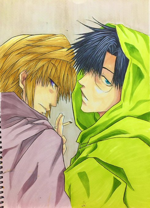 三蔵&八戒 八戒のレインコート明る過ぎたかな(^^; 不敵な感じ描くの楽しかった😊 #最遊記 #三蔵 #八戒 #アナログイラスト #コピック #模写