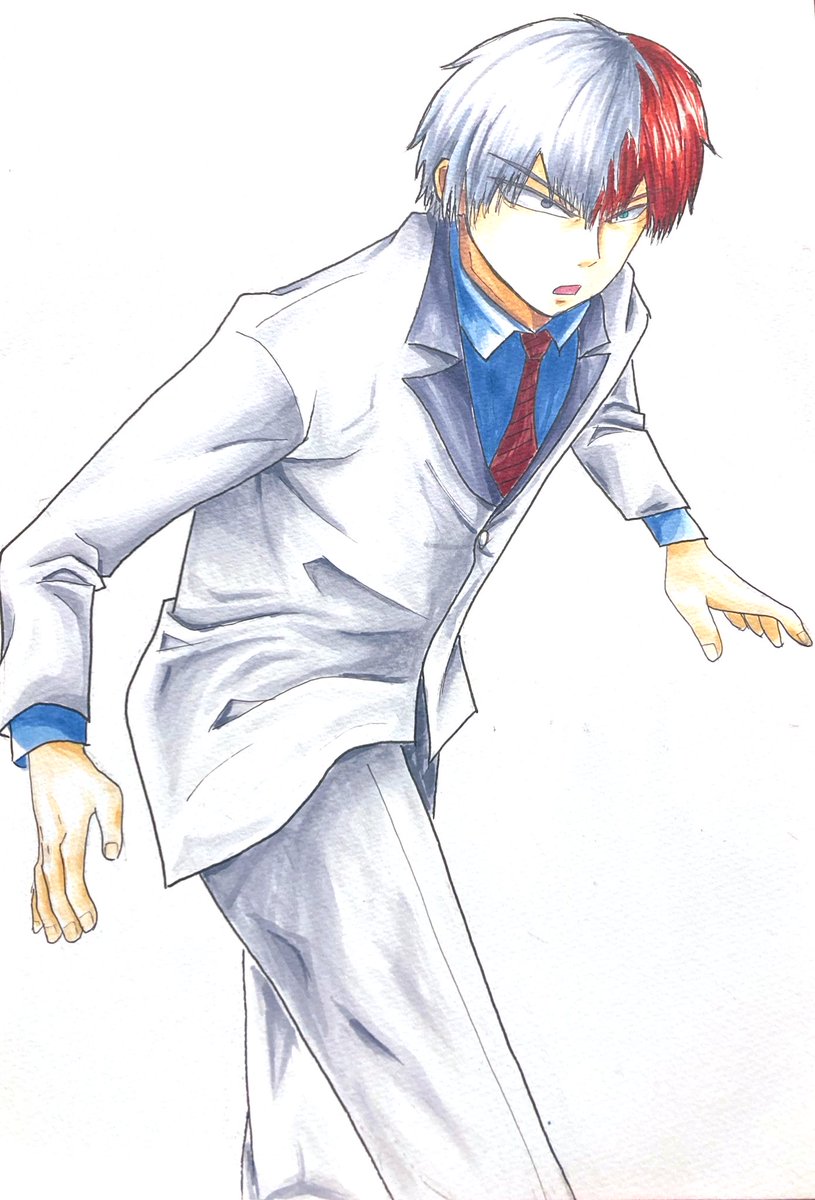 映画スーツの轟くん 氷出す動作の手のパターンと足のパターン両方カッコ良いですよね。 この絵でも服の皺練習💪ズボンが難しい…。 #ヒロアカ #轟焦凍 #コピック #アナログイラスト #イラスト練習中