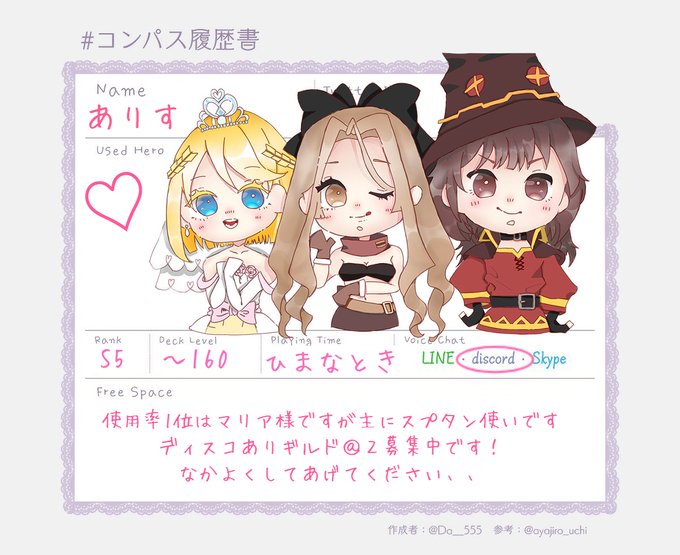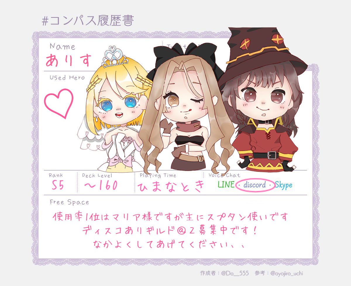 アリス使い取れたので更新!! ♡と♲でお迎えします! 名前アリス実装前からありすです アリス最推しです🫶🏻🫶🏻🫶🏻 他ゲーもお絵描きもしてるのでいつでも誘ってください🥰 #コンパス履歴書 #コンパスお絵描き #コンパス民と繋がりたい